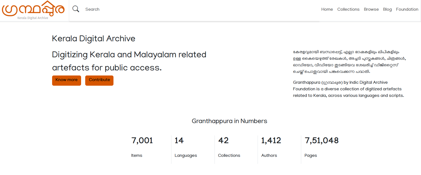 അച്ചടി പുസ്തകങ്ങൾ, കൈയെഴുത്തുപ്രതികൾ, അപൂർവ ഗ്രന്ഥങ്ങൾ, ആനുകാലിക പ്രസിദ്ധീകരണങ്ങൾ, സർക്കാർ രേഖകൾ, സ്വകാര്യ ശേഖരങ്ങൾ, ചിത്രങ്ങൾ, ഓഡിയോ, വീഡിയോ തുടങ്ങിയവയൊക്കെ ഉൾപ്പെടുന്ന ഈ 7,000-ത്തിലധികം രേഖകളുടെ ഡിജിറ്റൽ ശേഖരത്തിൽ, എല്ലാം ചേർന്ന് 7.51 ലക്ഷത്തിലധികം താളുകളാണ് ഡിജിറ്റൈസ് ചെയ്ത് ഗവേഷകരുടെയും പൊതുജനങ്ങളുടെയും ഉപയോഗത്തിനായി ലഭ്യമാക്കിയിരിക്കുന്നു.