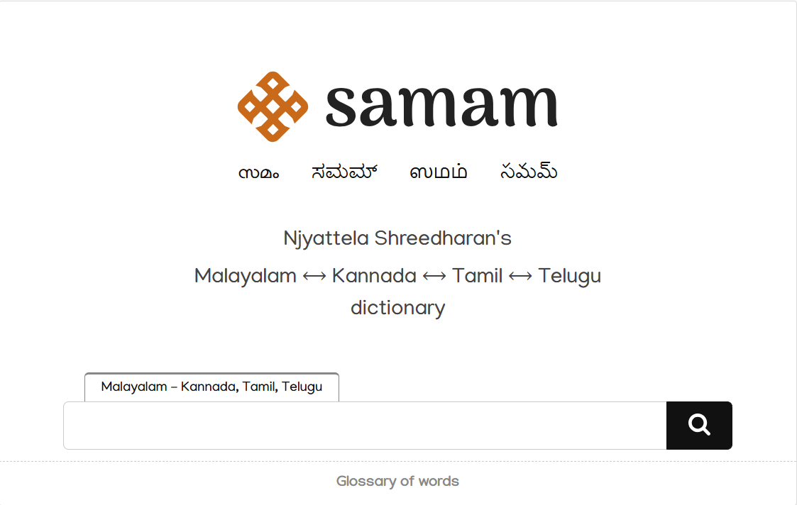 സമത്തിൽ (https://samam.net/) ഏകദേശം 17,000 വാക്കുകളുടെ അർത്ഥങ്ങൾ നാലു ദ്രാവിഡ ഭാഷകളിൽ (മലയാളം, തമിഴ്, കന്നഡ, തെലുങ്ക്) ലഭ്യമാക്കിയിരിക്കുന്നു.