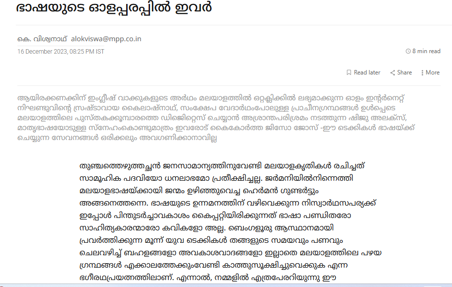 ആയിരക്കണക്കിന് ഇംഗ്ലീഷ് വാക്കുകളുടെ അർഥം മലയാളത്തിൽ ഒറ്റക്ലിക്കിൽ ലഭ്യമാക്കുന്ന ഓളം ഇന്റർനെറ്റ് നിഘണ്ടുവിന്റെ സ്രഷ്ടാവായ കൈലാഷ്നാഥ്, സംക്ഷേപ വേദാർഥംപോലുള്ള പ്രാചീനഗ്രന്ഥങ്ങൾ ഉൾപ്പെടെ മലയാളത്തിലെ പുസ്തകക്കൂമ്പാരത്തെ ഡിജിെറ്റെസ് ചെയ്യാൻ അശ്രാന്തപരിശ്രമം നടത്തുന്ന ഷിജു അലക്സ്, മാതൃഭാഷയോടുള്ള സ്നേഹംകൊണ്ടുമാത്രം ഇവരോട് കൈകോർത്ത ജിസോ ജോസ് -ഈ ടെക്കികൾ ഭാഷയ്ക്ക് ചെയ്യുന്ന സേവനങ്ങൾ ഒരിക്കലും അവഗണിക്കാനാവില്ല