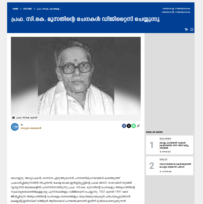 പ്രഫ. സി.കെ. മൂസതിന്റെ രചനകൾ ഡിജിറ്റൈസ് ചെയ്യുന്നു | Prof. C.K. Musat’s writings Digitizing | Madhyamam